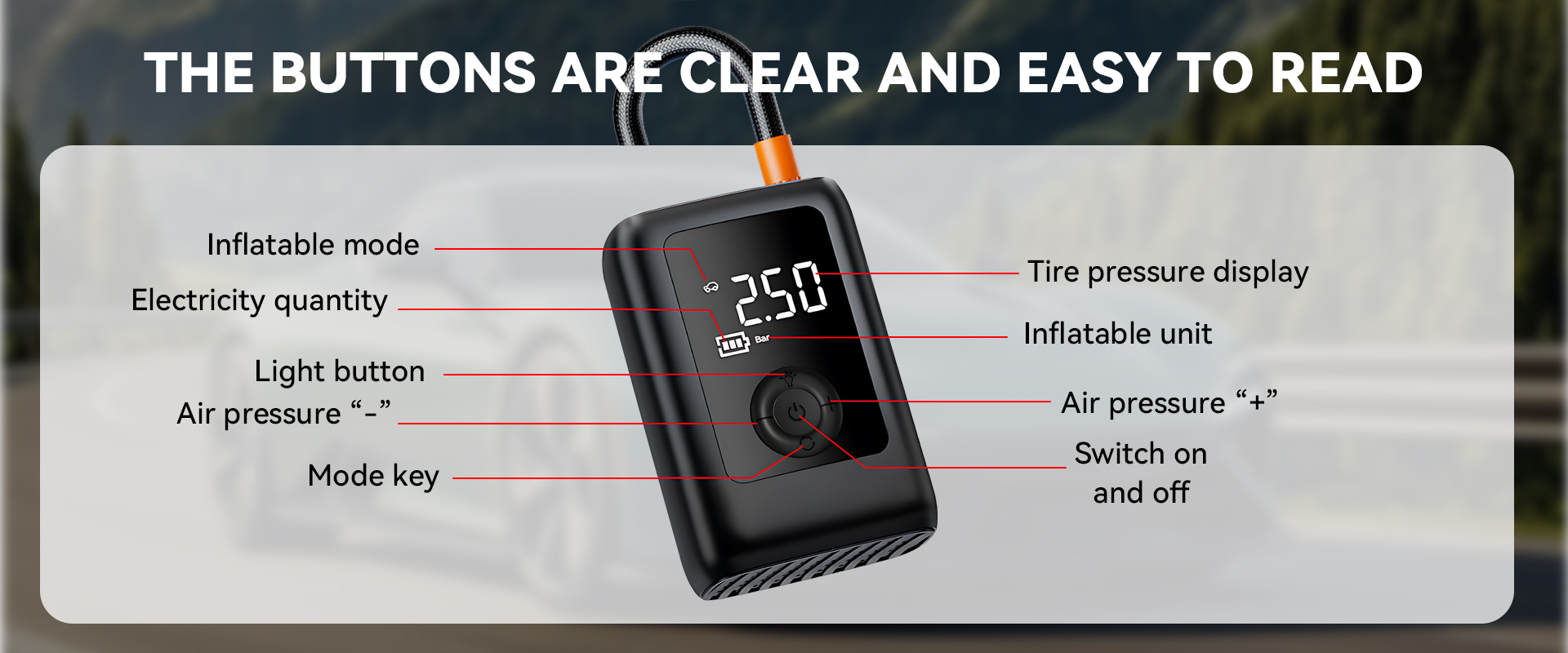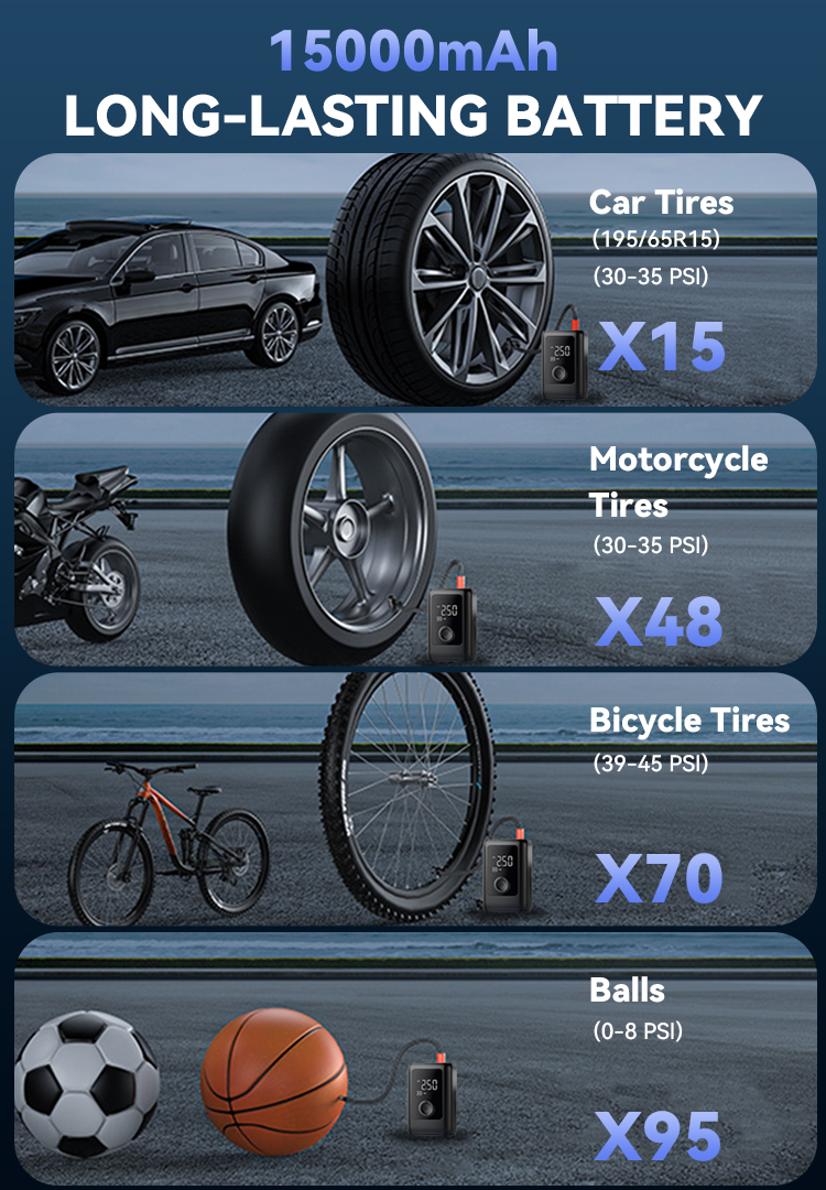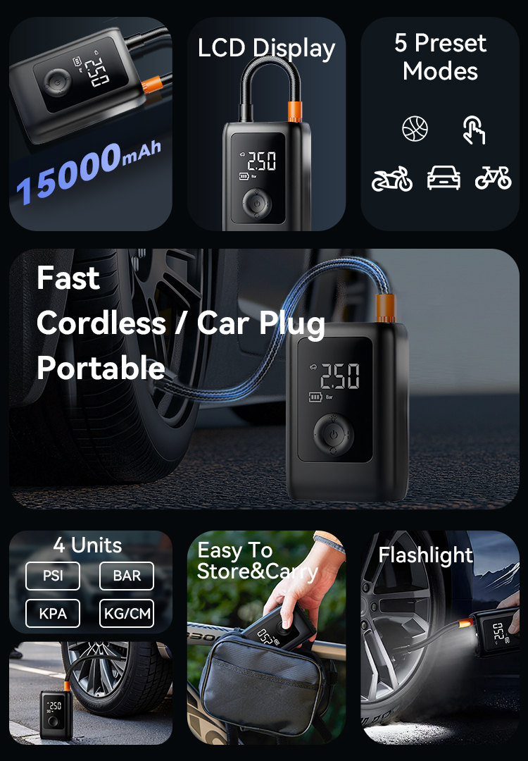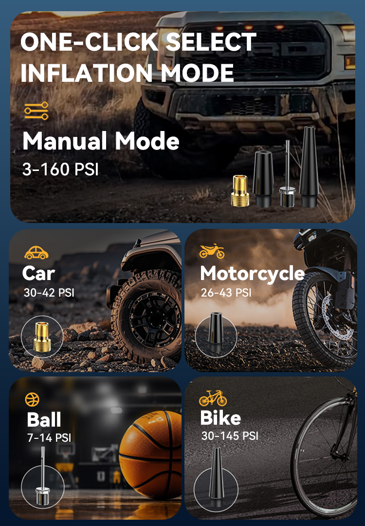 Set your desired tire pressure and start with a single button. The device stops precisely upon reaching the target, preventing over-inflation for added safety and convenience.
