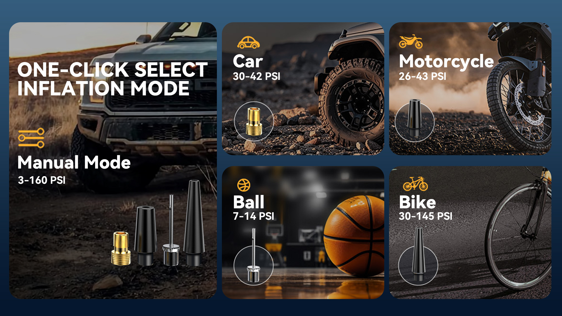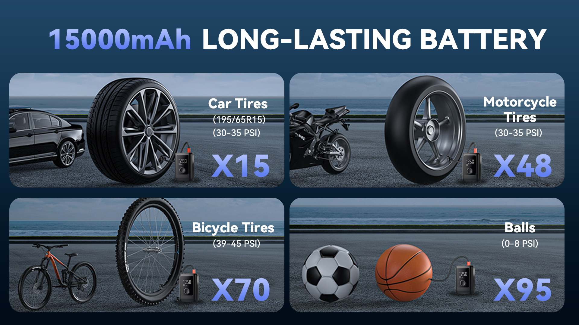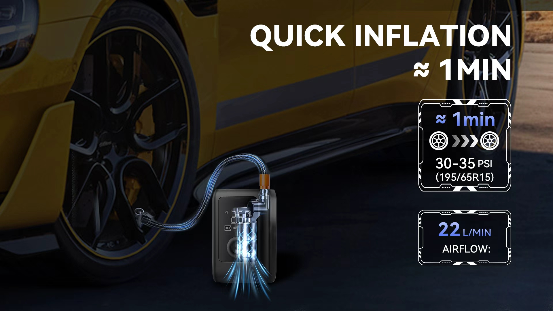 Set your desired tire pressure and start with a single button. The device stops precisely upon reaching the target, preventing over-inflation for added safety and convenience.