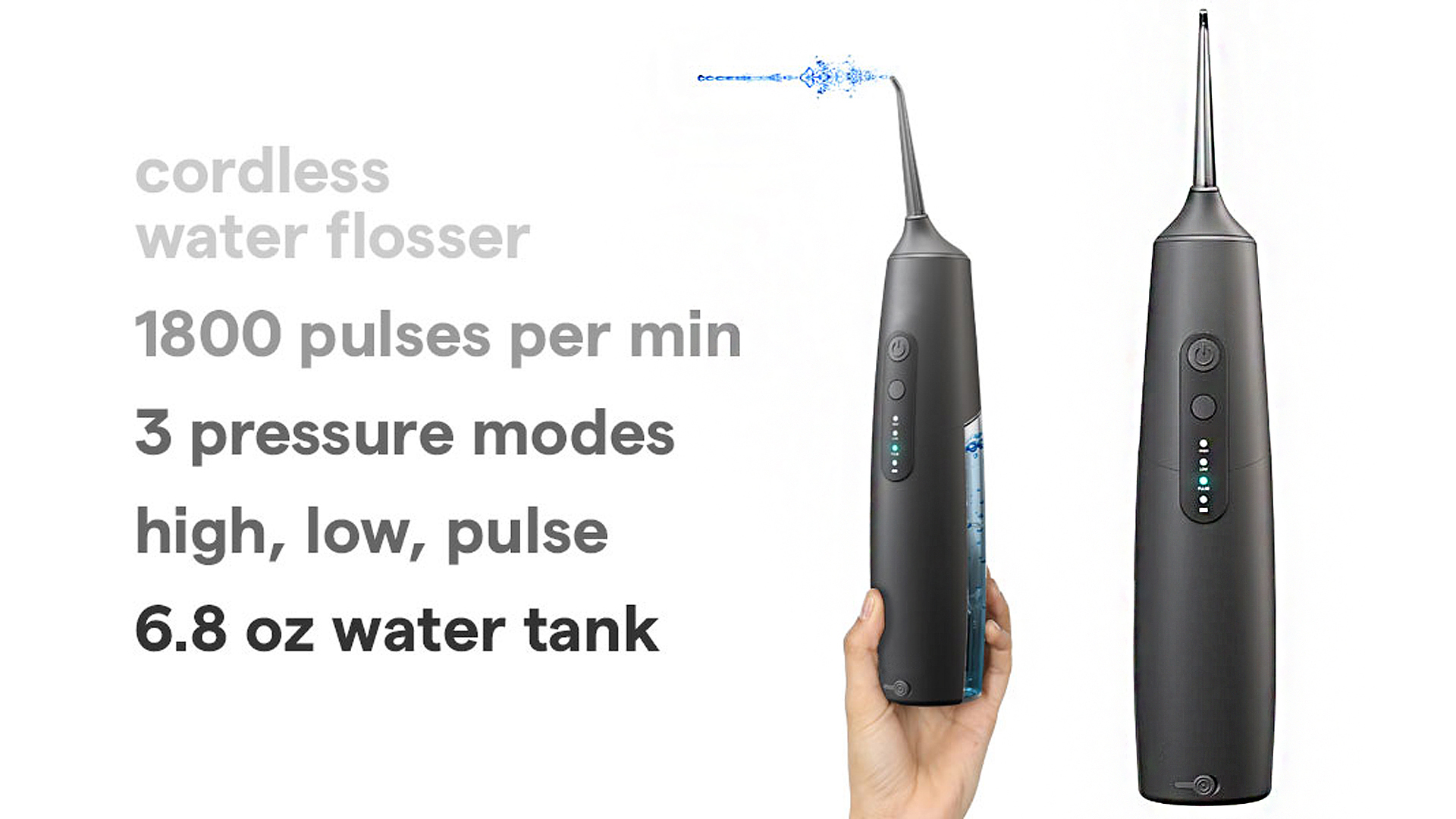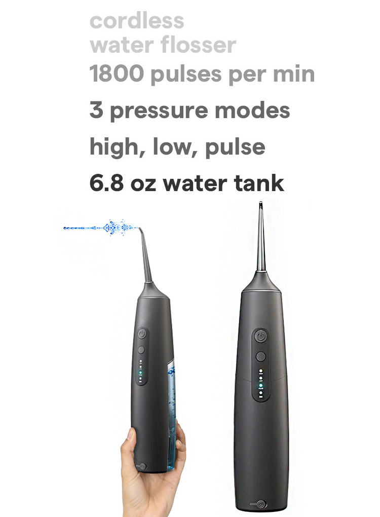 Our Newest Cordless Water Flosser offers a unique combination of water pressure with 3 flossing modes (High, Low, and Pulse) for the best teeth cleaning action and enhanced floss. Water pressure will massage your gums to prevent bleeding and deeply clean up dental calculus, food debris, that traditional flossing can't.